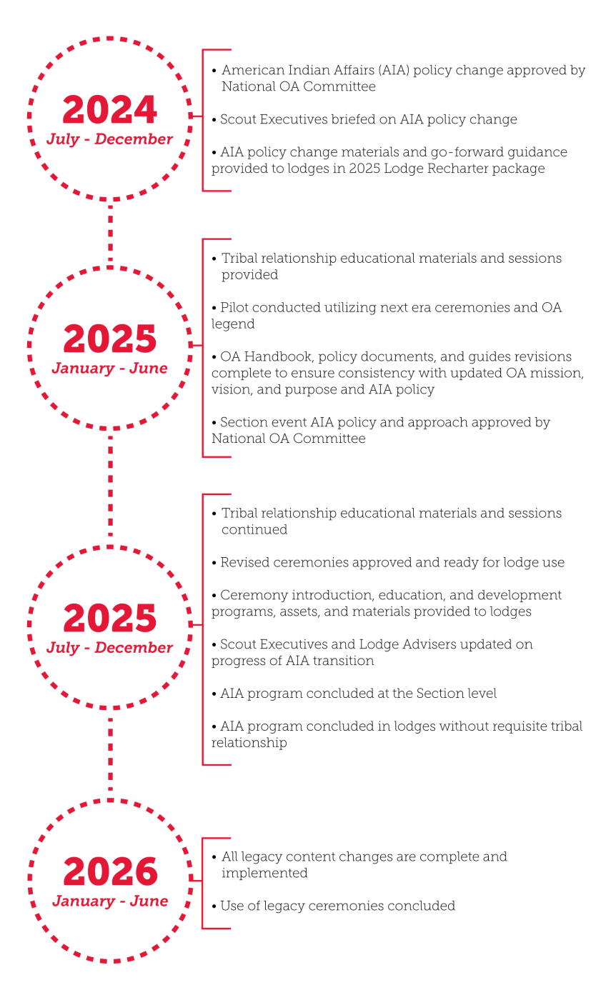 The National OA Committee approved its current policy on December 28, 2022. The policy is being implemented in phases through December 31, 2025 when all national-level American Indian programs will cease and lodges must have an agreement in place with a federal or state recognized tribe to continue programs locally. A detailed timeline has been provided to Lodge Key 3 members and Scout Executives.
